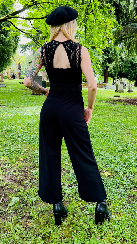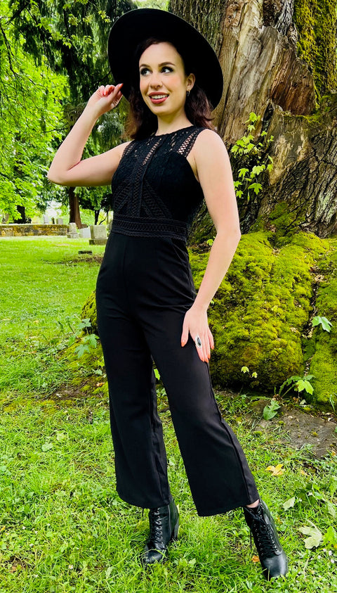 Kraft, elegance og et strejf af fare – Branwen Jumpsuit er dit mørkt chikke svar på drømme om gothic-øjeblikke i firmastil. Denne jumpsuit er et skræddersyet twist på vores elskede Agatha-kjole og har en indsnævret talje, vide ben og – ja – lommer, fordi hekse mener det alvorligt. Den blondebesatte overdel tilføjer et strejf af romantisk oprør, mens udskæringen bagpå giver lige nok intriger til bestyrelseslokaler eller kosteskafter. Lige dele struktureret og fortryllende.