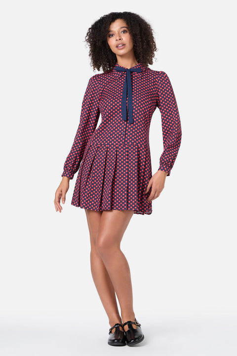 Med en sænket talje, spids krave, knapper foran til taljen og plisseret mini-nederdel handler denne stil om vintage flair. Kontrastfarvet snørebånd foran giver et sødt finish.