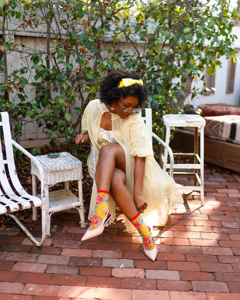 Ikke for sarte sjæle, vores gennemsigtige Flower Power-sokker er dristige og klare. Livlige orangerøde, solgule og slående akvamarinblå blomster bryder ud mod en gennemsigtig baggrund og skaber den perfekte harmoni af funky og elegant. En blød lyserød accent tilføjer et uventet twist, der gør denne sok til en sand samtalestarter.