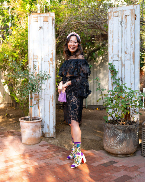Inspireret af Skønheden og Udyret har vores gennemsigtige, blomstrede sok i Stain Glass lilla, gule og blå blomstermønstre sammen med abstrakte lyserøde detaljer, der skaber illusionen af farvet glas. Færdiggjort med en lilla hæl, tå og manchet for det perfekte touch af elegance og femininitet.