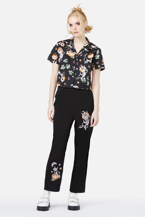 Legende, uhyggelig og ubesværet chic, Pumpkin Patch Kitty-blusen bringer et finurligt præg til din garderobe. Med et heldækkende ‘Pumpkin Patch Kitty’-print, skabt i samarbejde med kunstneren Ella Mobbs, er denne bluse en finurlig blanding af sjov og mode. Med korte ærmer og en klassisk krave, tilføjer den knaplukning foran og den korte længde et trendy touch. Den afslappede pasform gør den nem at style til afslappede dage eller legende aftener ude.