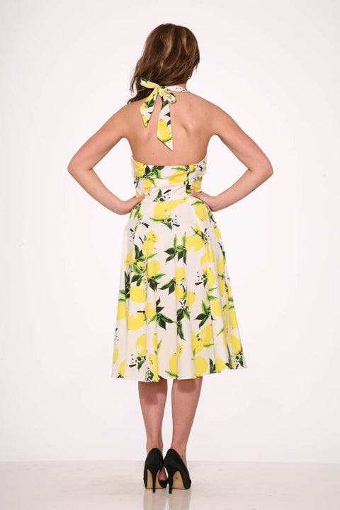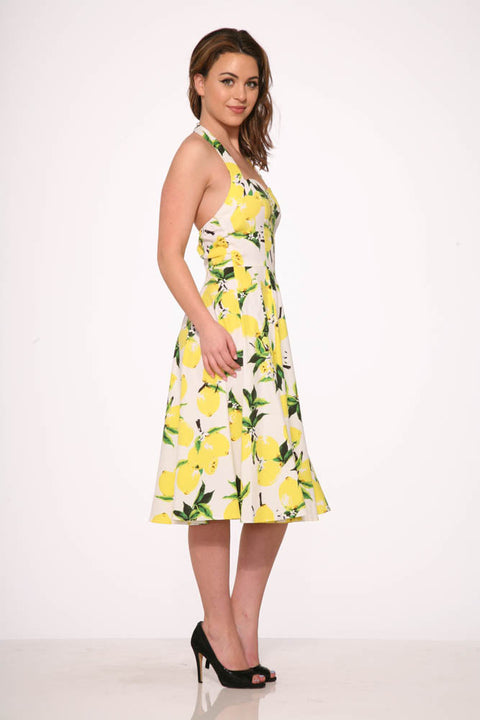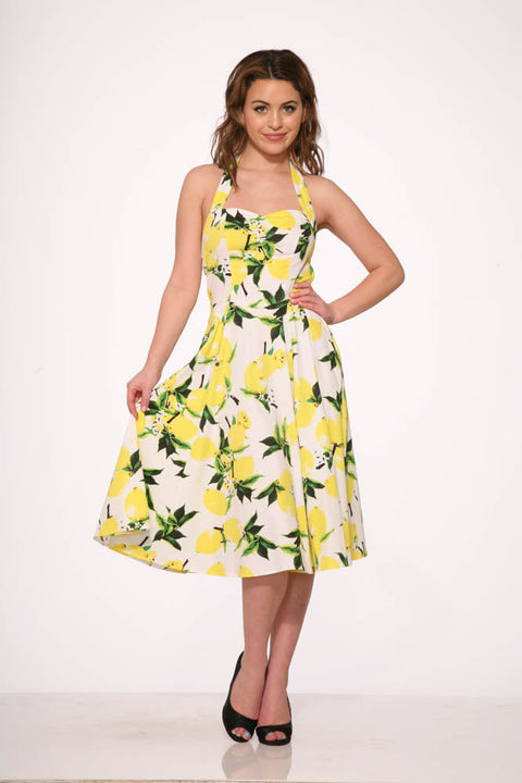 Når livet giver dig citroner – tag dem på! Orchid Bloom White Lemon Halter Swing Dress er en livlig, vintage-inspireret skønhed med et frisk citronprint på en sprød hvid baggrund. Med sin flatterende halterneck-udskæring og fulde swing-nederdel bringer denne kjole et strejf af solskin til hver eneste hvirvel. Bomuld-spandex-blandingen sikrer en sød og behagelig pasform, perfekt til picnics, fester eller bare til at lyse din dag op.