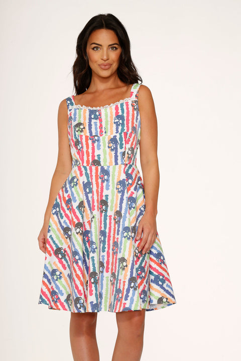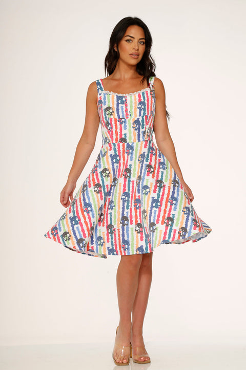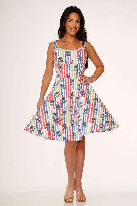 Giv din omgang energi og et strejf af farve med Orchid Bloom White Skulls Rainbow Swing Dress! Med et legende print af livlige regnbue-kranier mod en sprød hvid baggrund er denne retro-inspirerede pasform en perfekt blanding af sødt og rebelsk. Den er lavet af en behagelig bomuld-spandex-blanding og er klar til solskin, smil og at gøre et statement, uanset hvor du går hen.