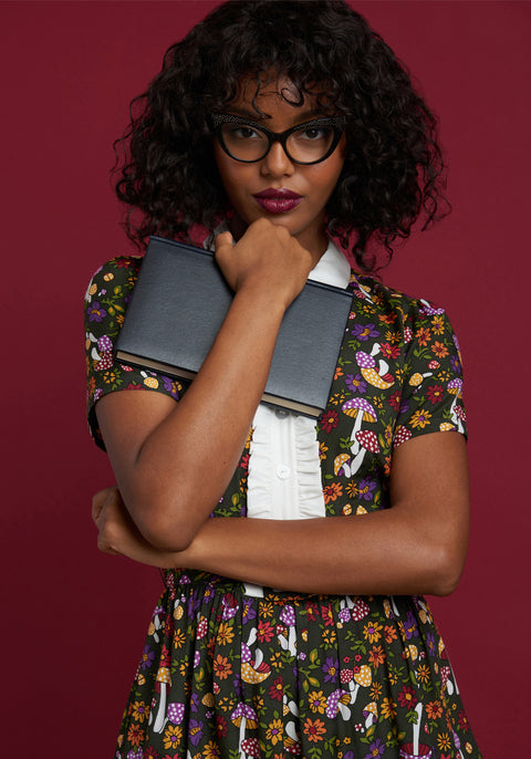 Som en hyldest til vores originale logo præsenterer vi dig med glæde et smukt nyt, håndtegnet tryk med en blød, mosgrøn skovbund fuld af yndige champignoner i nuancer af rød, gul og lilla, omgivet af muntre blomster og små babybiller. Denne yndige, tætsiddende kjole er lavet af et let vævet stof og er enestående med sin kontrasterende hvide, punkterede krave og flæsekantede knappestolpe ved overdelen. Denne 70’er-inspirerede minikjole har korte ærmer og et matchende og aftageligt bælte ved den rynkede talje, der fører til en flare-nederdel, der går over knæene, med praktiske sidelommer.