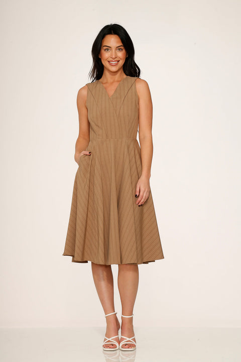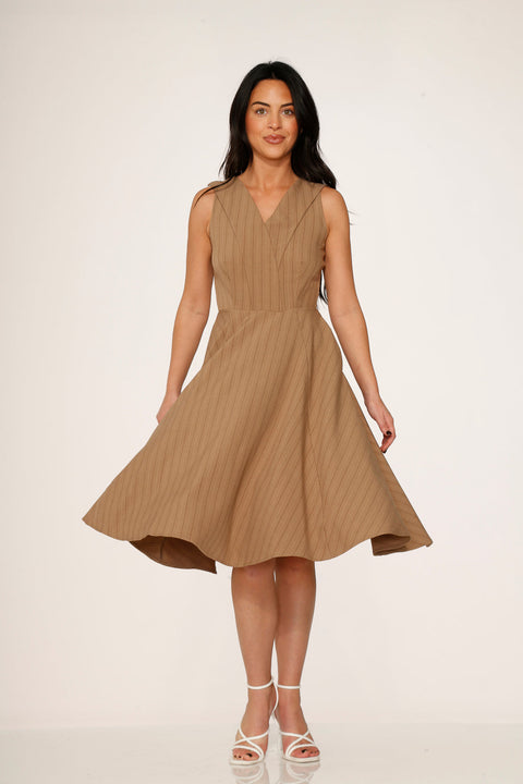 Underspillet elegance har aldrig set så godt ud. Orchid Bloom Camel Swing Dress har en raffineret V-hals overdel og en fyldig, flagrende nederdel for et look, der er ubesværet poleret. Diskret nålestribet tekstur tilføjer dybde og charme, mens den neutrale kamelfarve gør den til et tidløst must-have i garderoben.