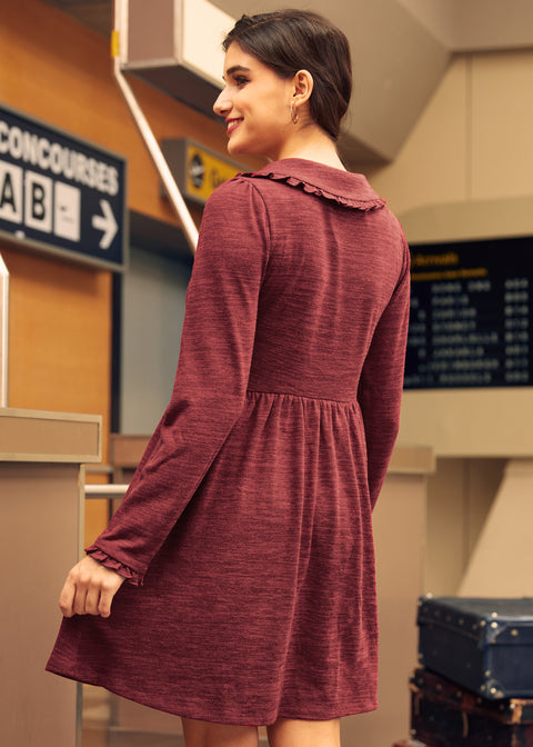 Fejr med stil med Touched by Time Ruffle Accent Dress i Crimson Embrace. Denne kjole er fremstillet af strikket stof med medium stræk og har en mørkerød farve, der minder om glædelig juledekoration. Flæsedetaljerne tilføjer et romantisk præg, mens kontrastsløjfen sikrer, at dit look skiller sig ud med et traditionelt, men dristigt statement, der passer til enhver julefest.