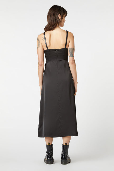 Omfavn elegant sofistikering med denne sorte kjole fra Dangerfield. Kjolen har en tætsiddende overdel, der elegant følger dine kurver, mens den vide nederdel tilføjer et strejf af femininitet og bevægelse. De justerbare skulderstropper sikrer en perfekt pasform, og den dristige slids foran i siden tilføjer lige den rette mængde charme.