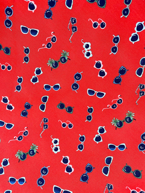 Et vintage-stykke med sjove, moderne detaljer i vores sjove solbrilleprint. Denne klassiske kjole inspireret af 100% bomuld er lavet af 100% bomuld og har en høj halsudskæring, et længere nederdel med skjulte sidelommer og lynlåslukning bagpå.