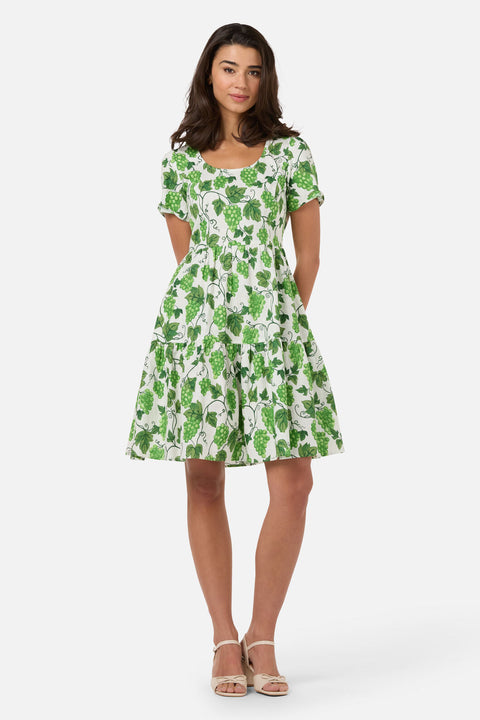 En romantisk sommerkjole inspireret af toscanske vinmarksvibes. Med saftige druer, snurrende vinstokke og frodige blade kombinerer denne grønne lagdelte kjole legende charme med ubesværet elegance – perfekt til solrige dage og haveture.