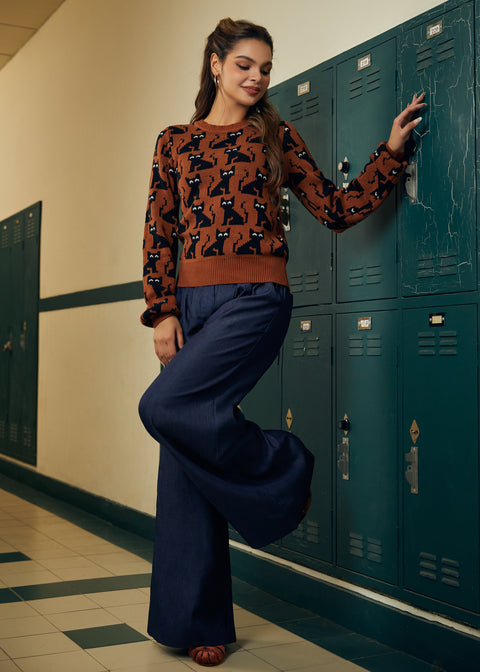 Bring lidt drillerier ind i din garderobe med Notes of Nostalgia Crewneck Pullover-sweateren fra vores navnebrormærke ModCloth. I Rustic Purr har denne hyggelige pullover et heldækkende mønster af nysgerrige sorte katte, hvis store øjne står frem mod en varm rustrød baggrund. Med sin klassiske runde halsudskæring, ribbede kanter og afslappede pasform er det et nemt lag-på-lag-stykke, der passer perfekt til overgangen fra efterårsgåture til uhyggelige sammenkomster. Kombiner den med din yndlingsdenim eller en legende nederdel for et look, der er lige dele hyggeligt, finurligt og katteagtigt.