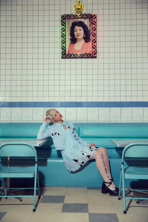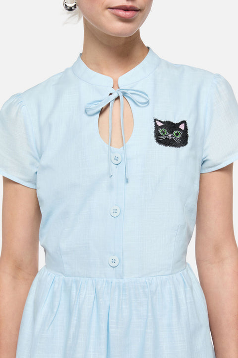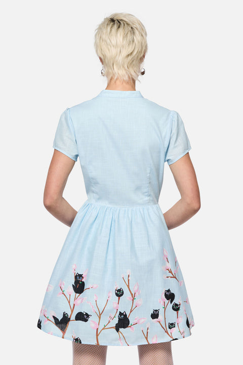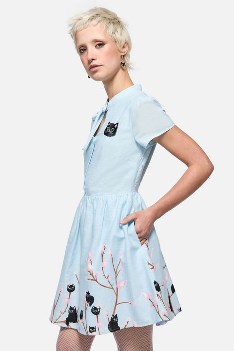 Så sød, at det gør ondt – Pussy Willow Border Dress fra Dangerfield er et yndigt nik til vintage-stil med et frækt twist. Med specialdesignet ‘Pussy Willow’-kunst (ja, det er killinger som blomster!) er denne revival-inspirerede mini-kjole perfekt til både 1940’er-modeelskere og moderne dukker. Den har en nøglehulskrave og knaplukning foran og er et sandt samlerobjekt for print-elskere og retro-romantikere.