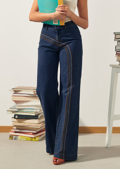 Dyk ned i 1970’erne med disse ModCloth-jeans! De er udsmykket med regnbuer og har en klassisk højtaljet silhuet med vide ben. Den mørkeblå nuance er fremstillet af en denimblanding med lav strækbarhed af 70% bomuld, 28% polyester og 2% spandex. Vores denim (9,5 oz efter vask) er bevidst let for at skabe det karakteristiske fald og flow i ærmet.Polyester tilføjer styrke og formbevarelse, standard for premium-denim. En lynlåsgylp og knaplukning giver et moderne touch. Roy G Biv-broderi løber fra forsiden til bagsiden og tilføjer et unikt præg.