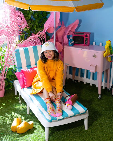 Iøjnefaldende smiley-ansigter i pastelfarver vil garanteret gøre dine fødder glade. Vi har tilføjet funky detaljer med margueritblomsterblade og hjerteformede øjne, hvilket gør denne transparente sok med smiley-ansigter ikke til din basale modesok. Den har en lyserød tå og hæl for maksimal munterhed.