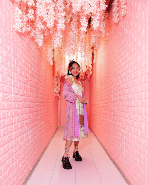Lyserøde og lilla solsikker gør denne sommerfugleblomstrede sok til forårets essens. Når finurlige sommerfugle bevæger sig op ad siden af ​​fødderne, blomstrer nogle til solsikker for et legende touch. Sat op mod et nøgent, gennemsigtigt stof for en blød og feminin stemning.