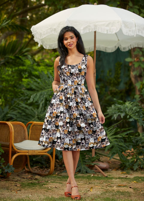 Retro Fit&Flare Kjole med Realistiske Katte