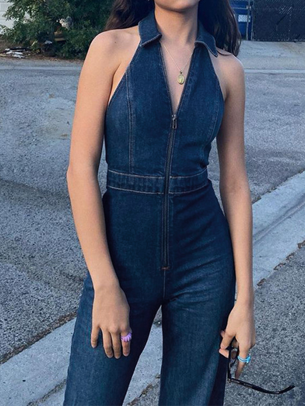 Backless Zip Up High Rise Denim Jumpsuits