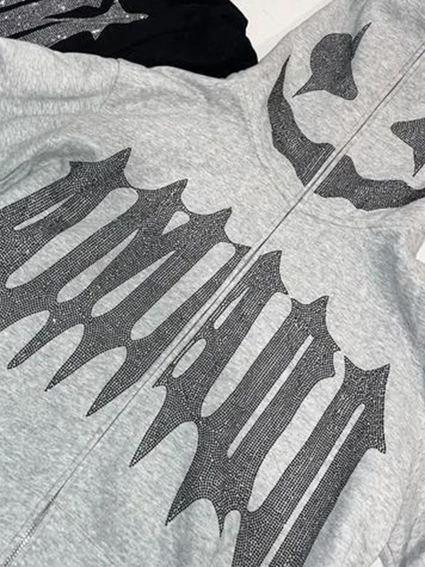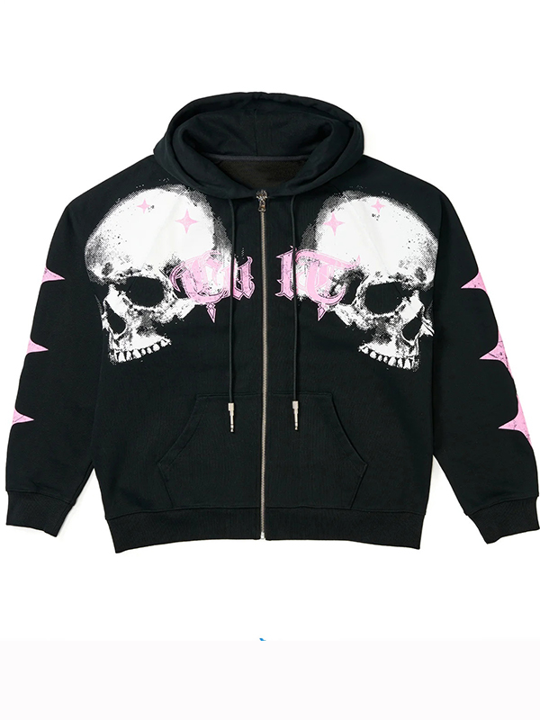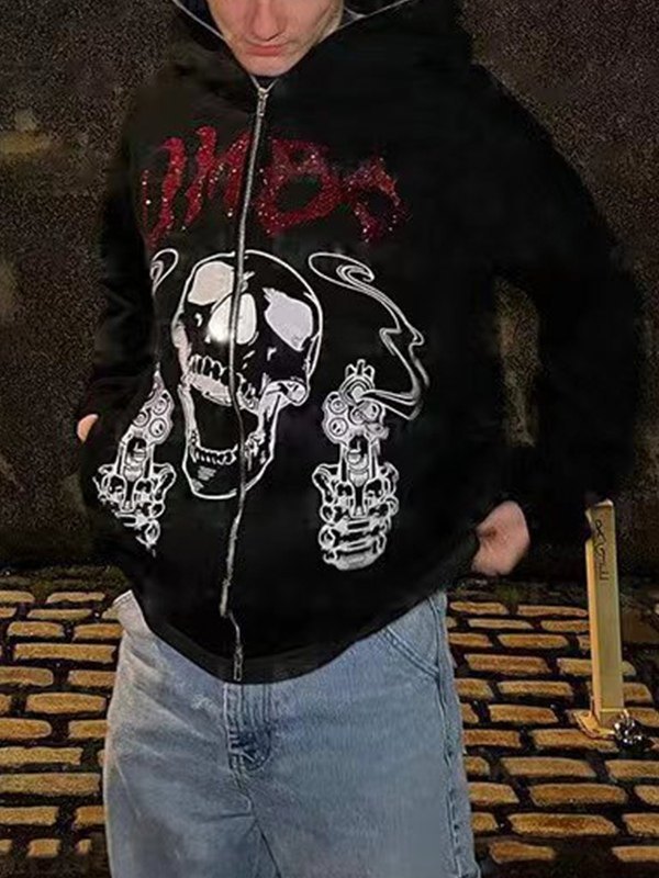 Men’s Rhinestone Letter Skull Black Zip Up Hoodie