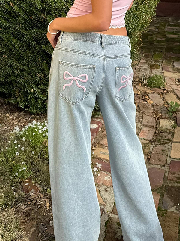 Pink Bow With Embroidered Back Pocket Boyfriend Jeans