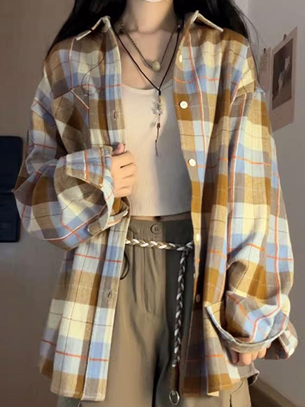 Vintage Contrast Plaid Print Long Sleeve Blouse