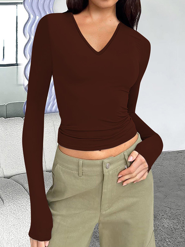 Solid V Neck Slim Long Sleeve Tee