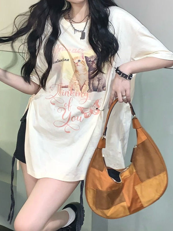 Cat Print Drawstring Oversized Short Sleeve Tee