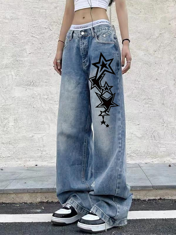 Star Print Vintage Blue Wide Leg Boyfriend Jeans