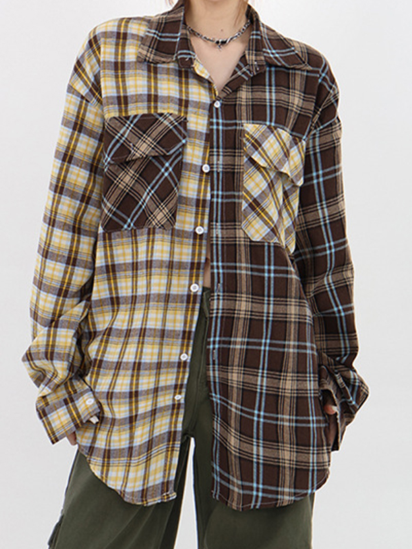 Vintage Plaid Splice Long Sleeve Blouse