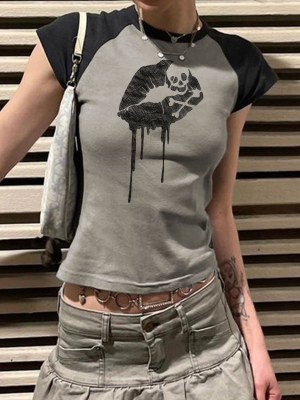 Vintage Lip Print Ragla Short Sleeve Tee